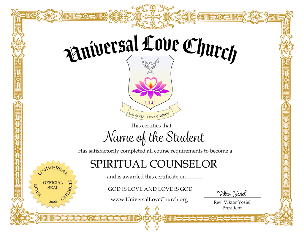 Al terminar este curso se otorgará el diploma de Consejero Espiritual y los graduados tendrán suficientes herramientas para guiar, consolar, o ayudar a sanar a todos aquellos que se acerquen en busca de apoyo. Durante todo este curso los estudiantes contarán con el apoyo de la Iglesia para ayudarles a comprender el material de la clase y responder cualquier inquietud. Cada lección va acompañada de tareas que le permitirán comprender mejor el material estudiado. El curso no expira por lo que podrá estudiar de acuerdo a sus posibilidades.
